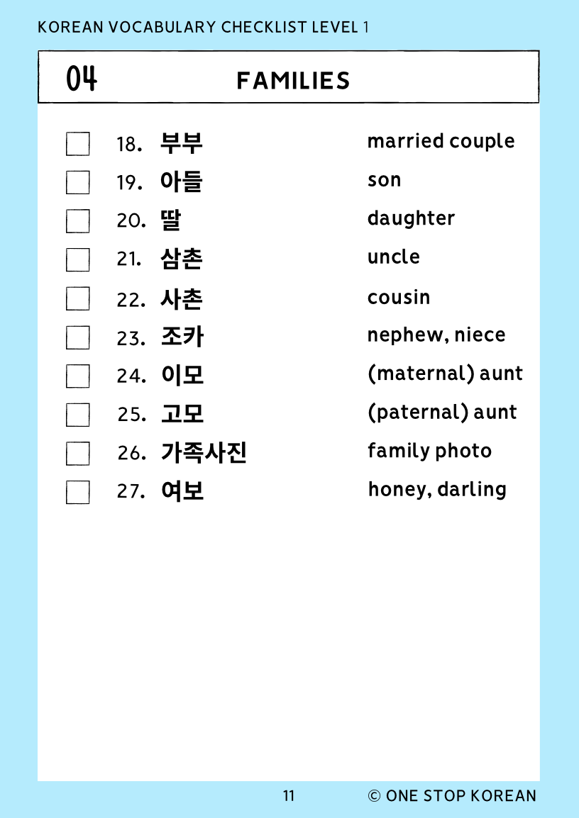 This is from the KOREAN VOCABULARY CHECKLIST LEVEL 1.